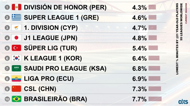 直播吧10月18日讯近日,足球权威统计机构CIES发布最新统计,全球55个联赛中U21球员出场时间占比最少的联赛,秘鲁联赛4.3%居首,J联赛4.8%第4,K联赛6.4%第6,中超7.3%第9。