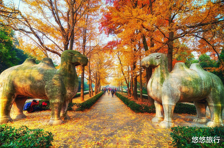 明孝陵石象路,银杏、枫香树叶色彩最丰富。顺路逛美龄宫,“项链”步道梧桐正黄。