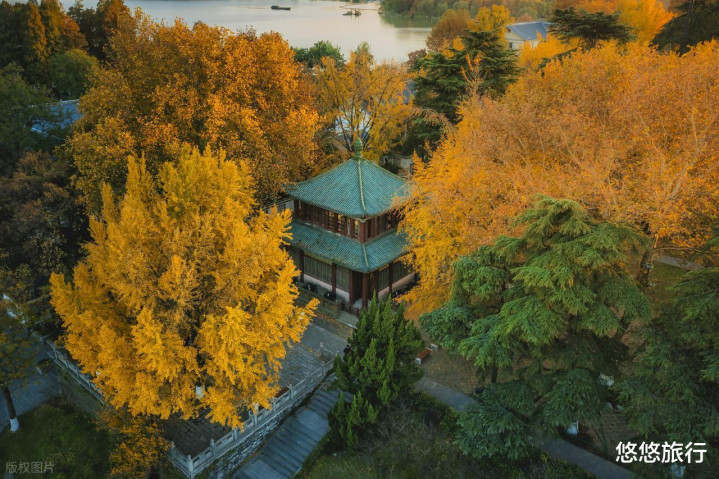 中山陵音乐台,梧桐暖黄映白鸽。玄武湖梁洲银杏映湖面,灵谷寺深林藏禅意,无梁殿旁千年银杏满树金。