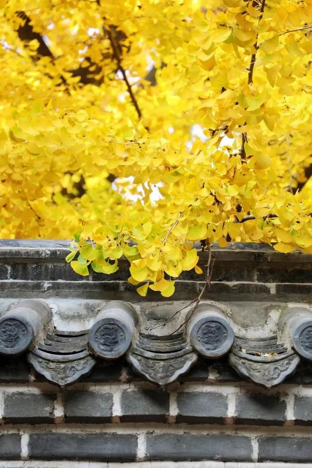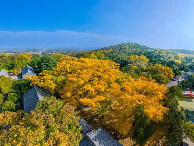 这棵穿越千年时光的古银杏树,被誉为植物“活化石”。每到深秋时节,挂满金黄树叶的树枝,错落交替,枝枝相扣,绘织成一片金黄的云霞,笼罩着古老的定林寺,将秋天的绚烂渲染到极致。