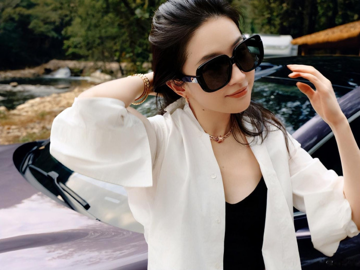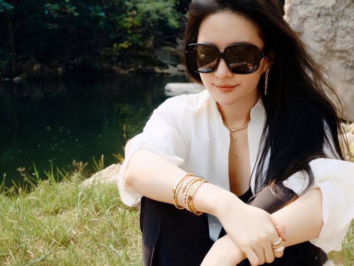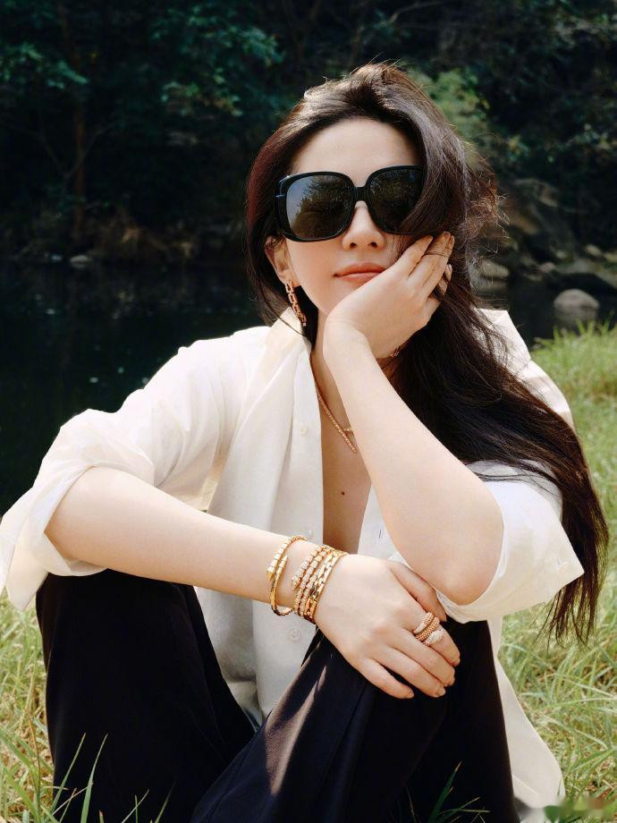 接下来便是刘亦菲的超绝美照啦!照片中,刘亦菲披着长发,戴着墨镜,化着精致妆容,美的不得了。她单手托腮看着镜头甜笑,无论怎么看都是美美哒。