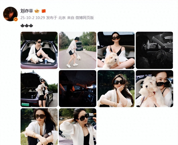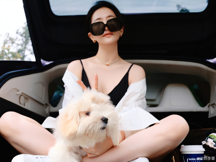 38岁刘亦菲晒国庆出游照, 坐后备箱撸狗超惬意, 穿吊带衫又瘦又美