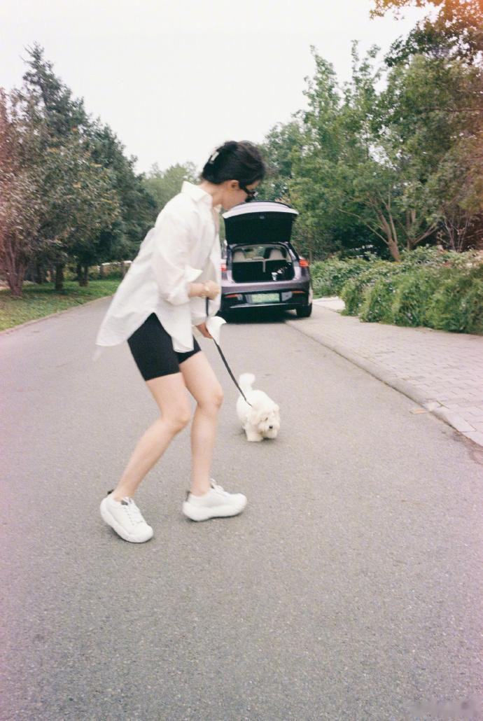 刘亦菲还在路上遛起了狗狗,从下图看,狗狗似乎不想走,刘亦菲在前面使劲儿拉着,莫名就被这幅画面给可爱到了,哈哈哈。