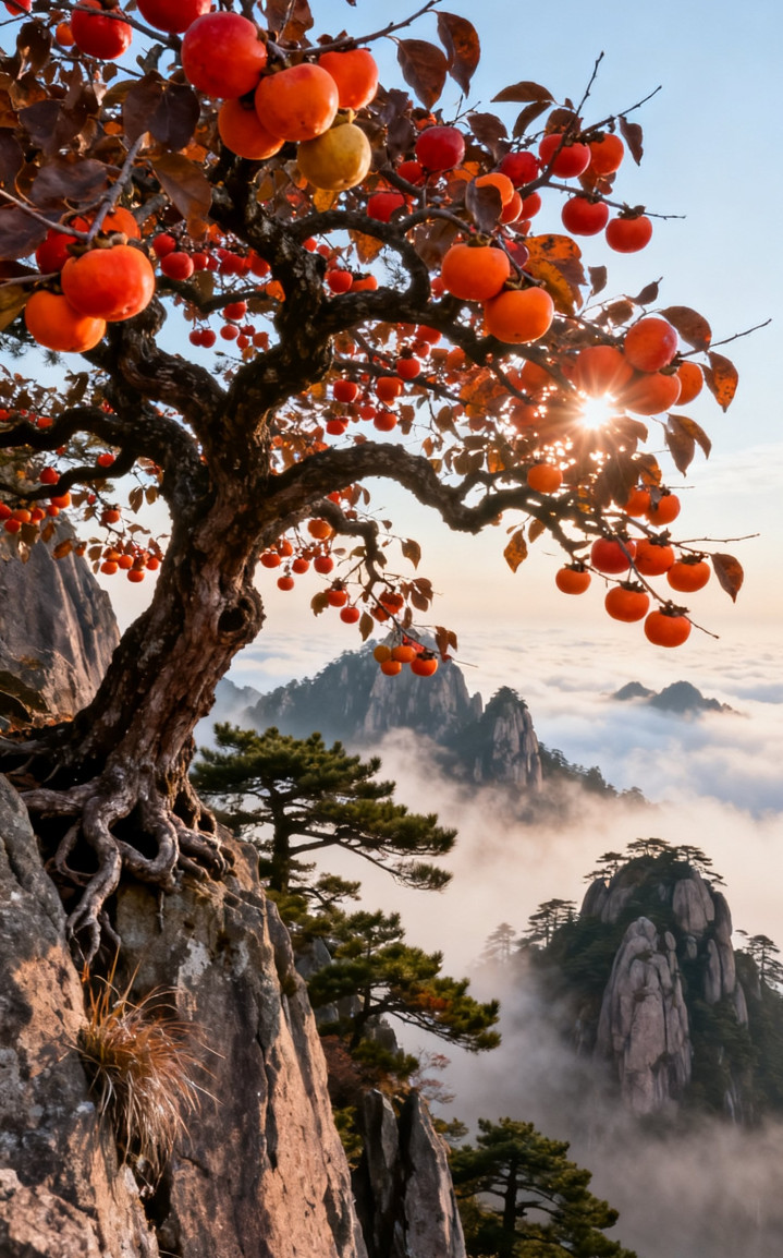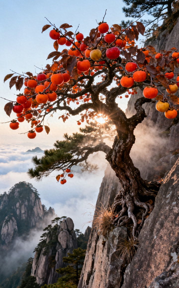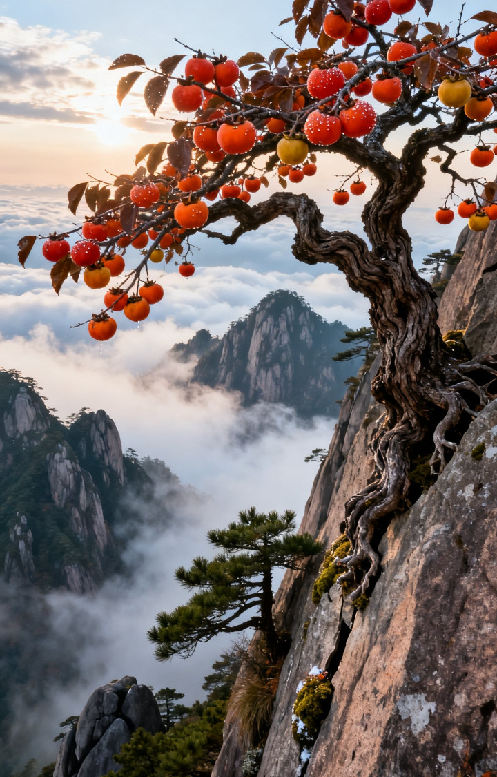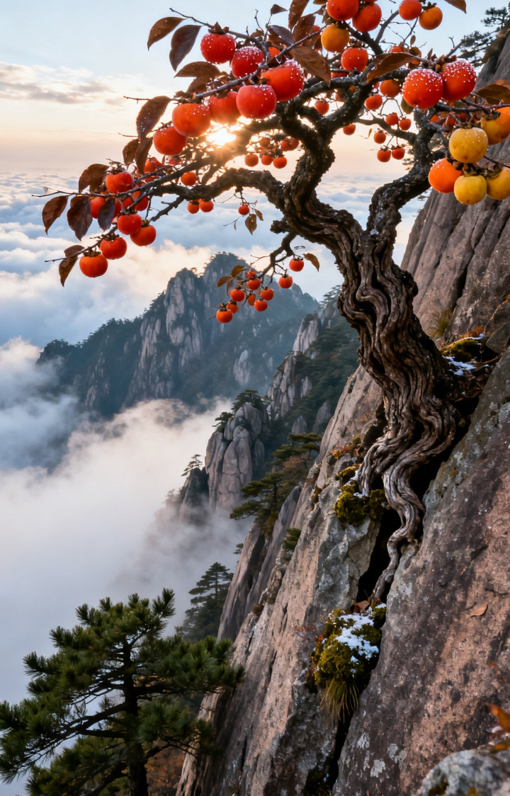 黄山之巅柿子树美景, 太漂亮了