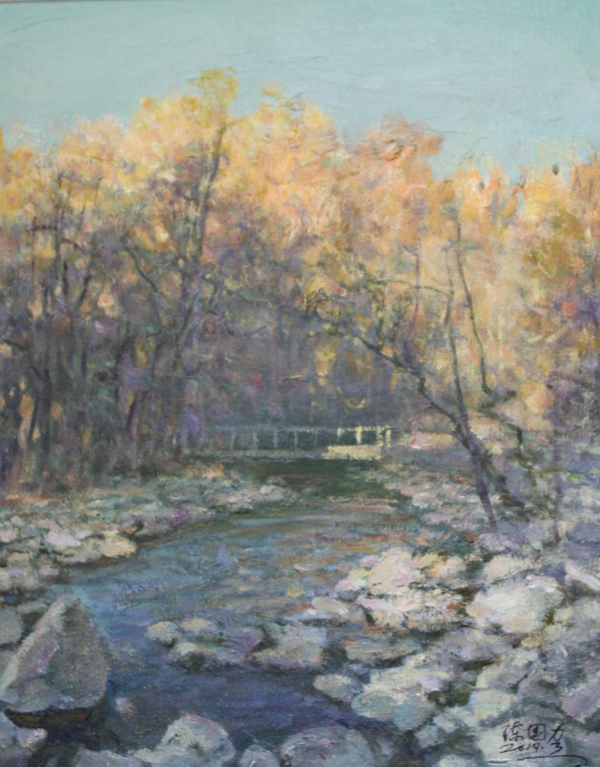 陈国力这幅油画作品,笔触凝练,感情深沉,内敛,但有十足的力量。桥,是这幅画的主角,占据画面的C位。但它若隐若现,还被光影挡住了一部分桥身。但它就静静地在那里架着,每天,任由无数人从身上跨过,几十年如一日。这个桥,见证了这个村子的一切生老病死,荣辱悲欢。