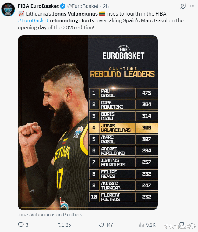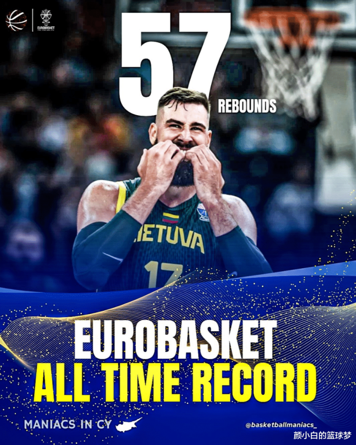 此役立陶宛男篮还在瓦兰的带领下单场拼下57个篮板创造欧锦赛单场篮板新纪录。