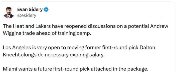 据NBA名记Evan Sidery报道:湖人、热火就威金斯重启谈判,前者愿意出克内克特为主的筹码,后者索要首轮。
