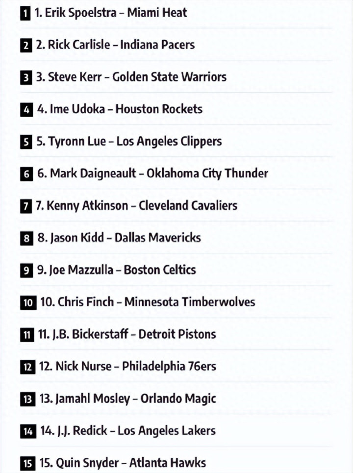 而美媒也给各队主帅,进行了相关排名。其中勇士主帅科尔仅次于斯波和卡莱尔,进入了榜单前三名。湖人雷迪克作为菜鸟教练,上赛季才正式出山,所以他仅排在第14位,倒也没有太大问题,甚至可以说美媒够客气了。