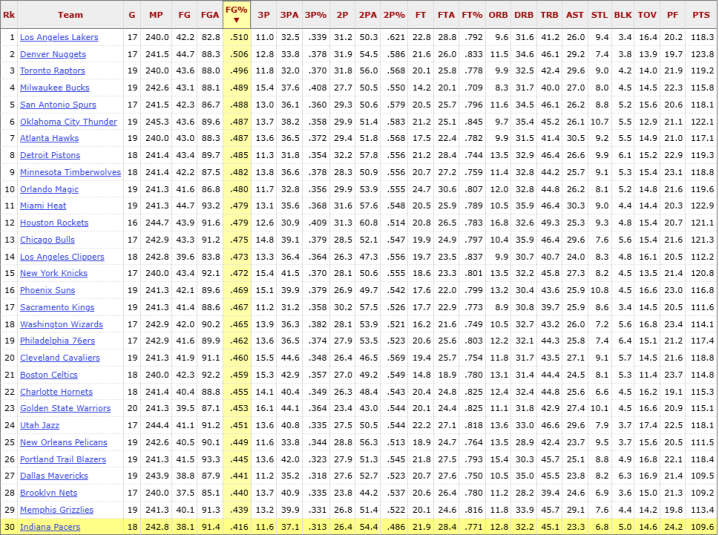 根据篮球数据网站BasketballReference的统计,步行者目前在场均投篮命中数(38.1记)上排名联盟倒数第二,场均投篮命中率(41.6%)、三分命中率(31.3%)和助攻数(23.3次)三项数据均排名倒数第一,场均得分(109.6分)也仅仅高于独行侠与篮网。