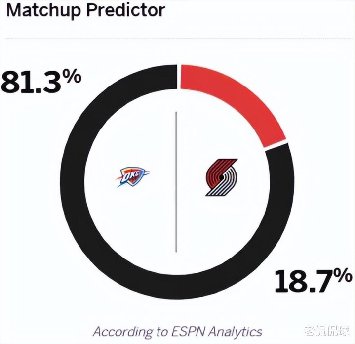 赛前,美媒ESPN对本场比赛进行了胜率预测,雷霆胜率高达81.3%,开拓者胜率则仅有18.7% ,差距非常明显。